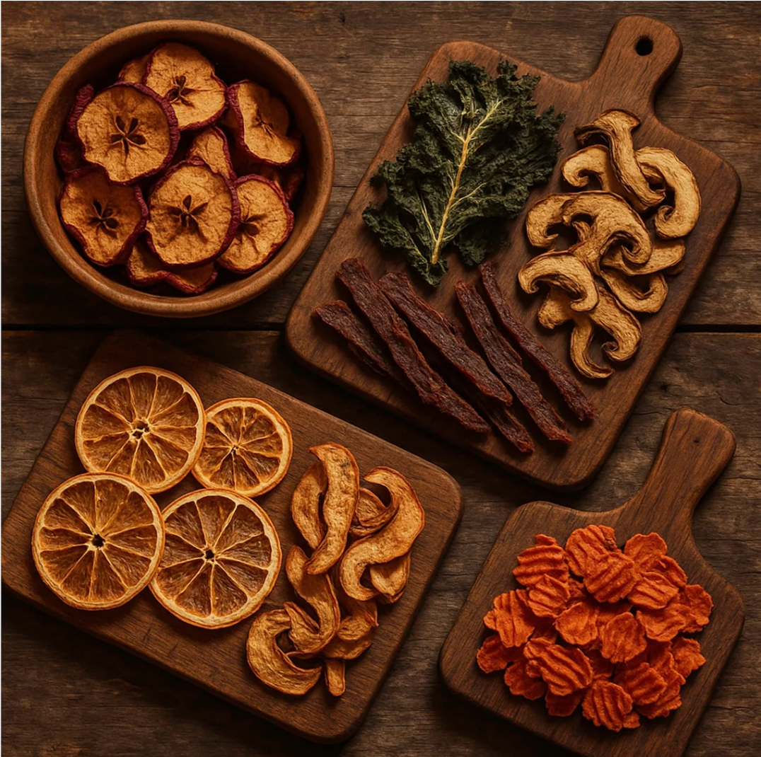 - Creates healthy snacks like apple chips, dried herbs, and jerky
